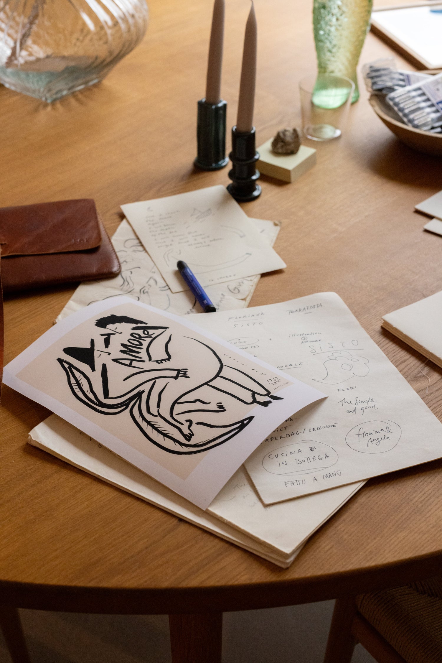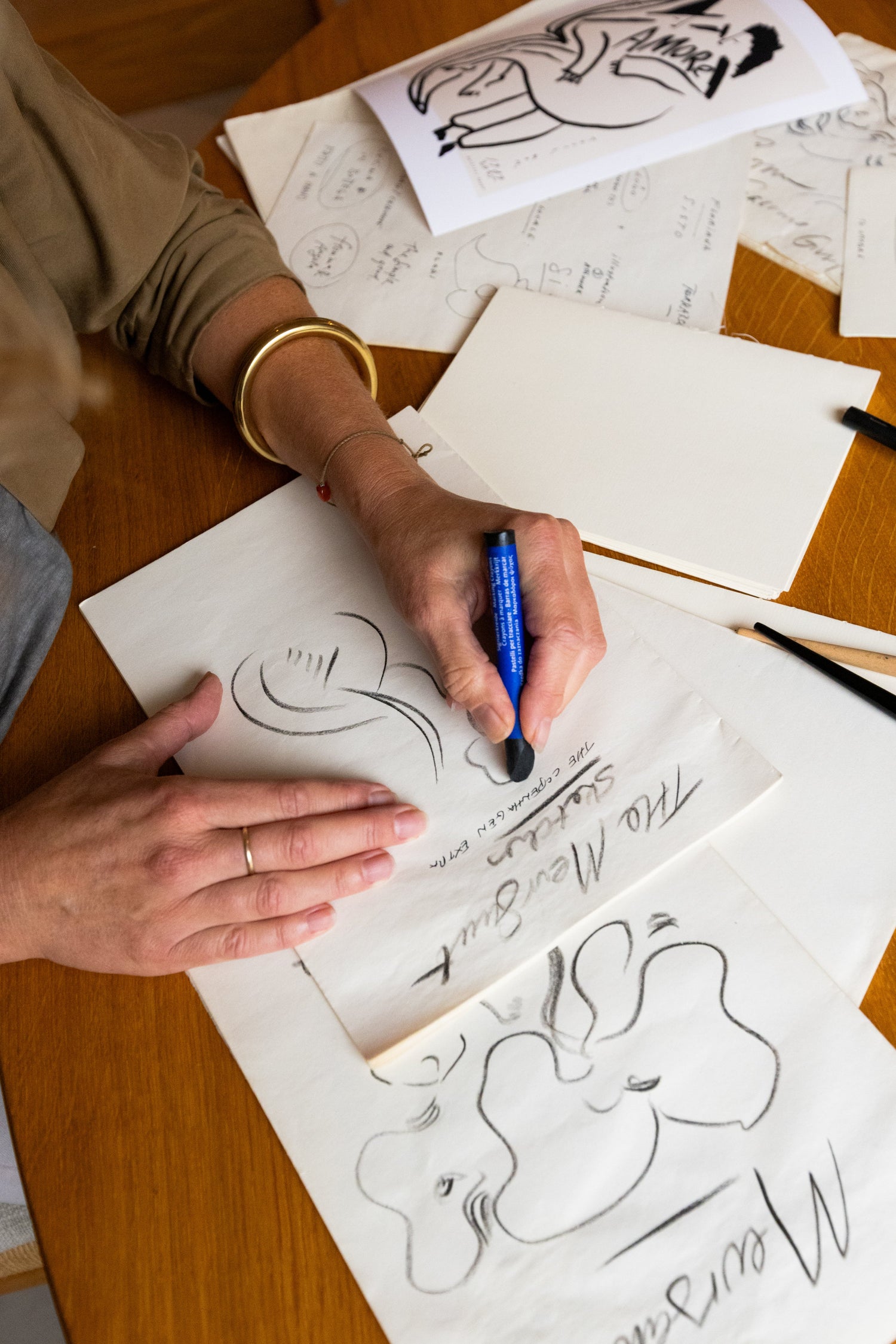 Hos Sarah starter alt med en fornemmelse: en farve, en bevægelse, en tanke eller en lille sætning. Processen handler om at lytte og give plads, så idéen selv kan finde sin form. Der skitseres, skrives og eksperimenteres – nogle idéer bevares i deres rå form, mens andre udvikles gennem gentagelser. Farverne fungerer som en vigtig medspiller og sætter stemningen. Essensen er at give plads og være åben.