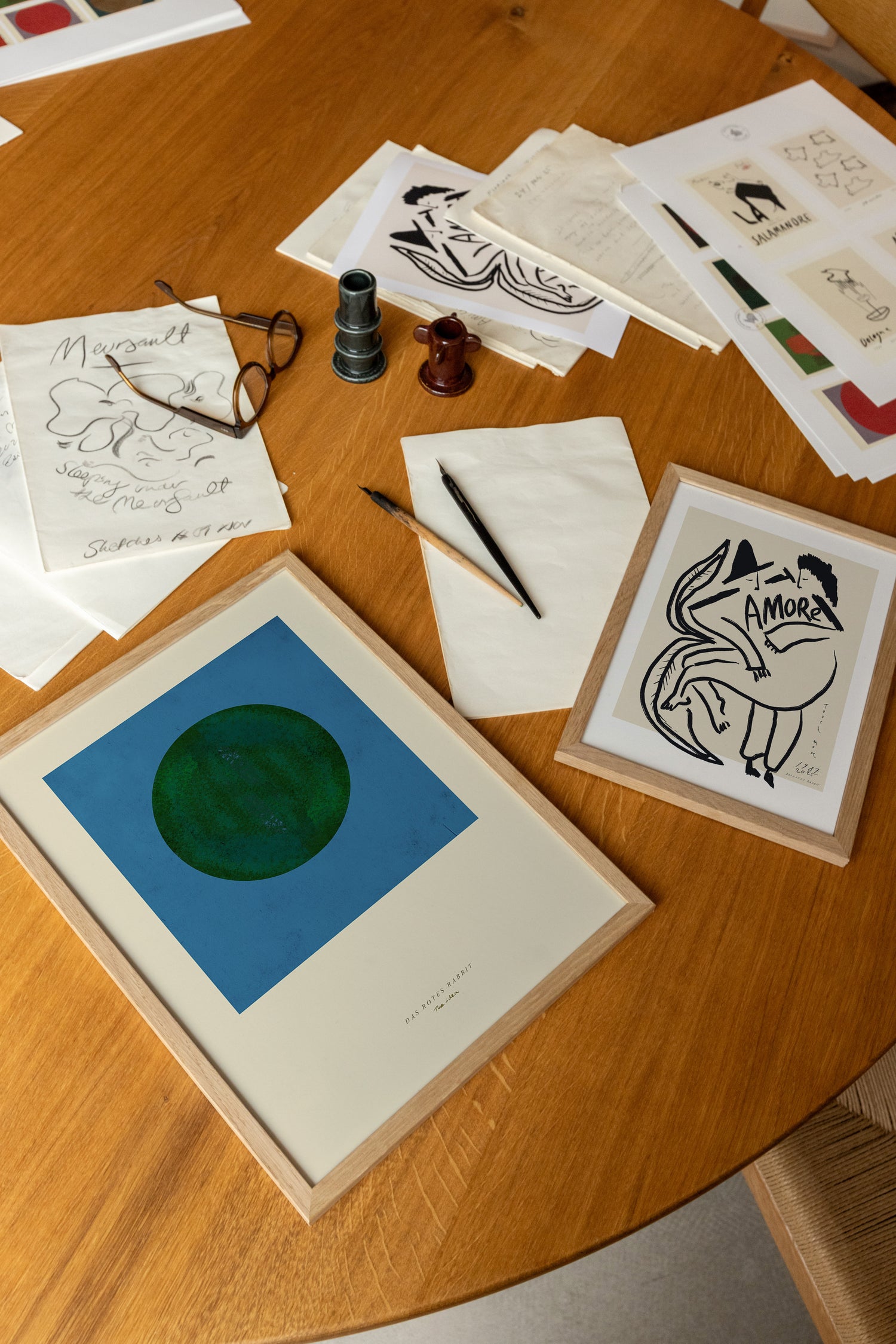 Kunstneren bag Das Rotes Rabbit, Sarah, er født og opvokset i København og brugte mange af sine formative år på at rejse i Central- og Sydamerika med sin far, der arbejdede som fotograf. Rejserne åbnede for en stærk resonans og passion for lys, farver og forholdet mellem os og verdenen, vi lever i – tematikker, som fortsat præger hendes arbejde i dag. I 2003 afsluttede hun en kandidatgrad i Visual Arts & Communication fra Danmarks Designskole. Siden da har hun drevet sit studio, Das Rotes Rabbit, hvor hun arbejder på tværs af visuel konceptudvikling, branding og kunst. Sarah arbejder fra sit studio og bevæger sig frit mellem små, intime skitser og større strukturerede værker og projekter. “Min proces begynder ofte med noget lidt uhåndgribeligt: en følelse, en sætning eller et ord, eller en bestemt farve. Jeg øver mig bevidst i ikke at kontrollere idéen eller processen for meget,” fortæller hun. I stedet skitserer hun, skriver og tegner meget og lader retningerne opstå undervejs.