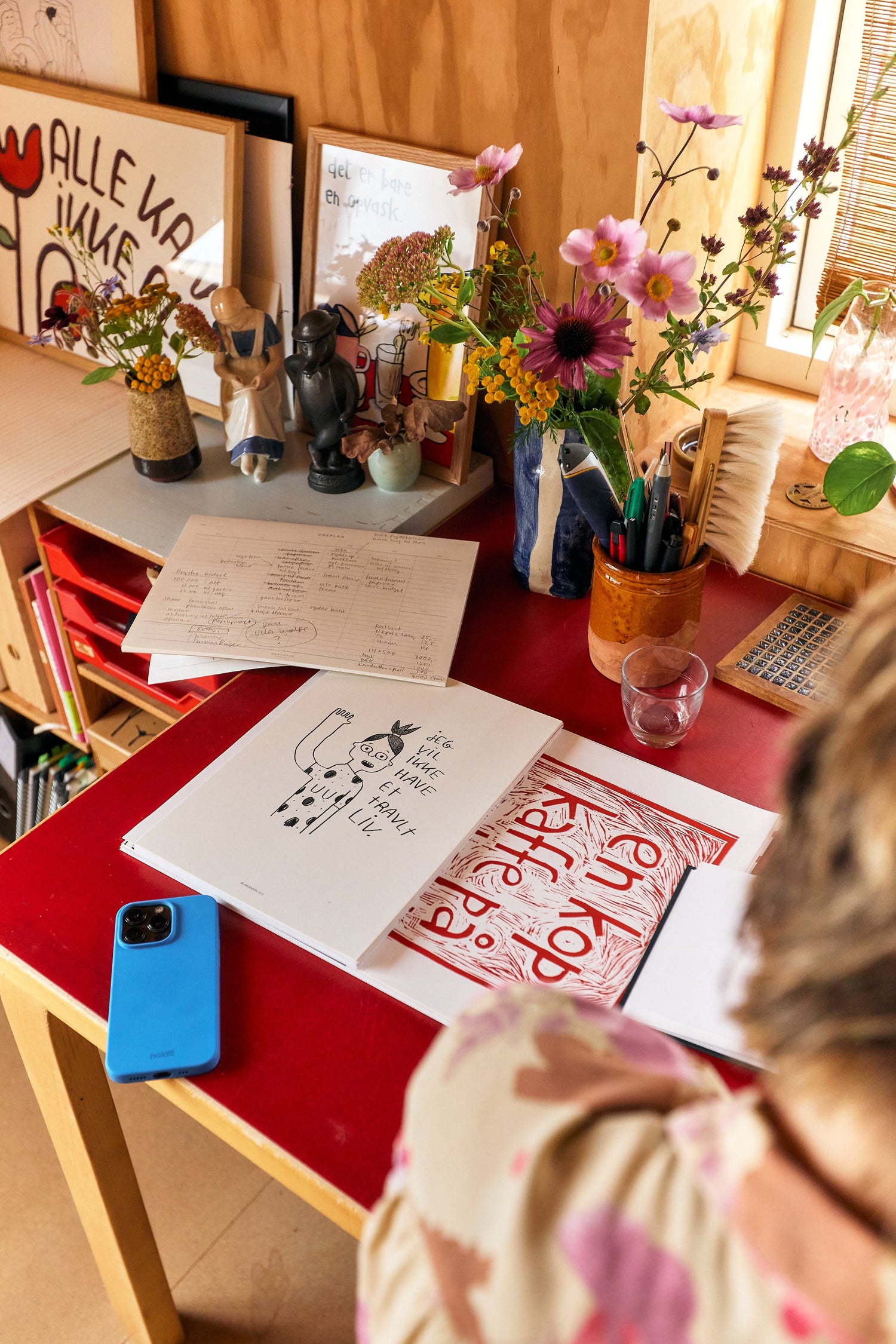 Hendes kunstplakater bringer hverdagens sårbarhed og humor ind i hjemmet. med enkle streger skildrer hun kaos, kaffen på bordet og øjeblikke, hvor det hele drøner. farver og form er afdæmpede, men stemningsfulde – kunst og æstetik møder rå følelser.