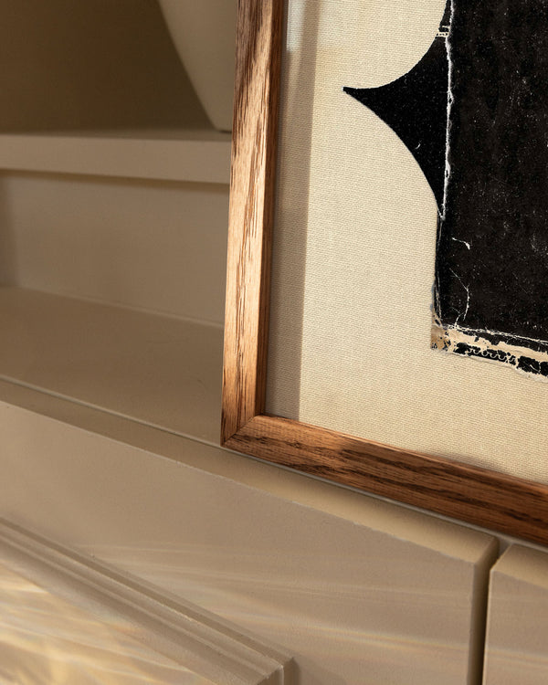 Rammerne i eg er lavet af massivt egetræ. Den mørke variant er bejdset for at opnå en dyb, varm tone, mens den sorte ramme er fremstillet af sortmalet fyrretræ med samme elegante profil.