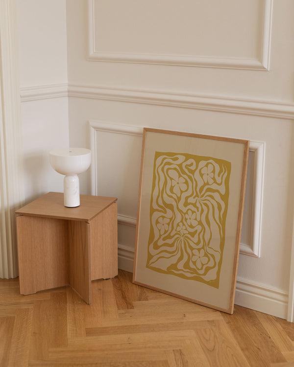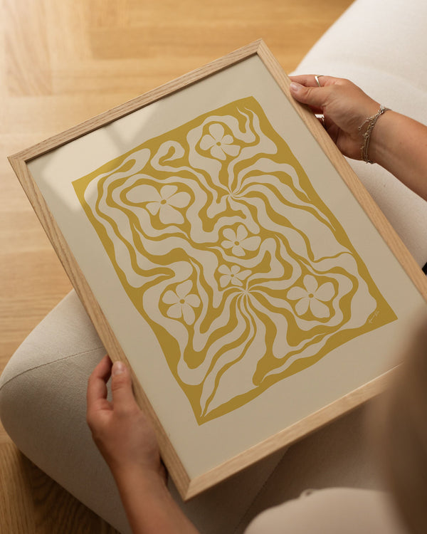 Kunstplakaten: “Golden stems” af kunstnerne Hanna KL er en grafisk illustreret plakat der er eksklusivt lavet til Peléton. Det har været betydningsfuldt for dem, at plakaten står til fri fortolkning. Dette værk er en del af en samling af eksklusive kunstplakater der udtrykker minimalisme og enkelhed.