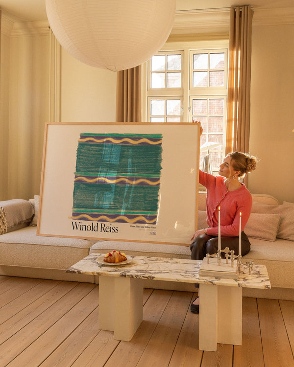 Kunstplakaten: “Green Lines and Yellow Waves” af kunstneren Paul Klee er en malet plakat, der er genskabt af Peléton. Denne plakat er en del af Pelétons vintage kollektion med museums layout. Kunstplakaten er produceret på kvalitetspapir, med lang levetid, høj gennemtræk og detaljerig farvegengivelse.