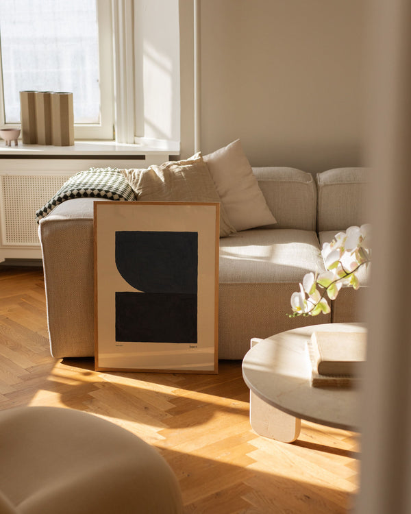 Kunstplakaten: “LEO” af Harrt Studio er en abstrakt plakat der er kurateret af Peléton. Leo tegningen er inspireret af moderne kunst og arbejder hovedsageligt omkring den monokromatiske forskning, geometriske abstrakte former, der blander sig for at skabe en kombination af motiver med minimalistisk og ren æstetik.