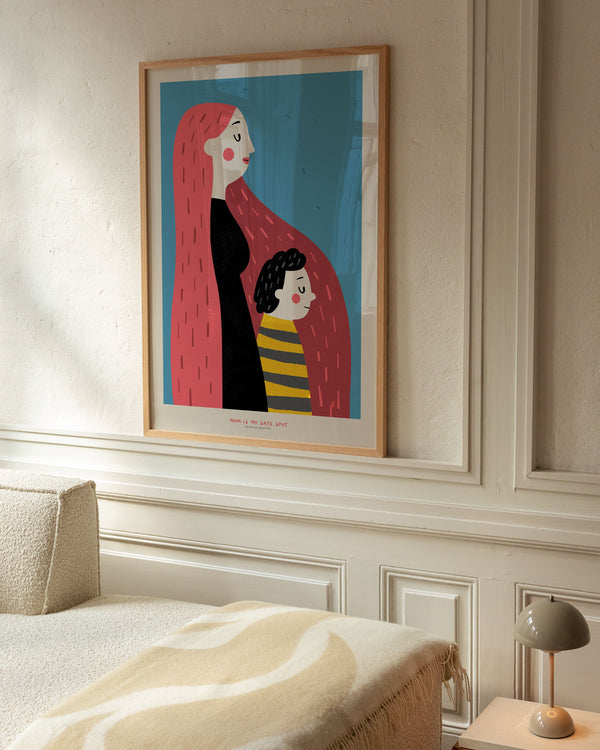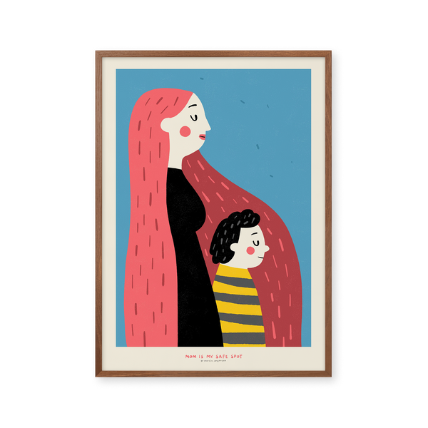Kunstplakaten: “Mom is my safe spot” af kunstneren Martin Jørgensen er en illustreret plakat der er kurateret af Peléton. Det har været betydningsfuldt for Martin Jørgensen, at plakaten står til fri fortolkning.