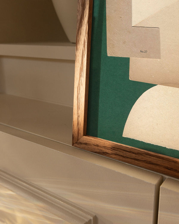 Rammerne i eg er lavet af massivt egetræ. Den mørke variant er bejdset for at opnå en dyb, varm tone, mens den sorte ramme er fremstillet af sortmalet fyrretræ med samme elegante profil.