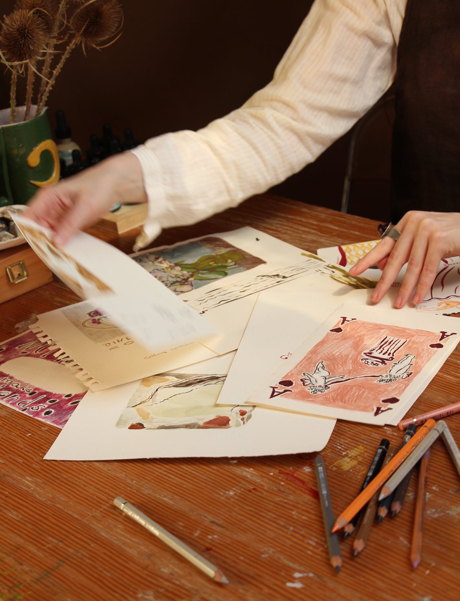 Inspired by her background in literature and textile design, she enjoys telling stories through her works, and like a piece of fabric that falls randomly, her work strives for a certain fluid quality and absence of perfection. Within this, there is always a sense of playfulness and often humor. For her, art can be a place of comfort, a way to find peace.