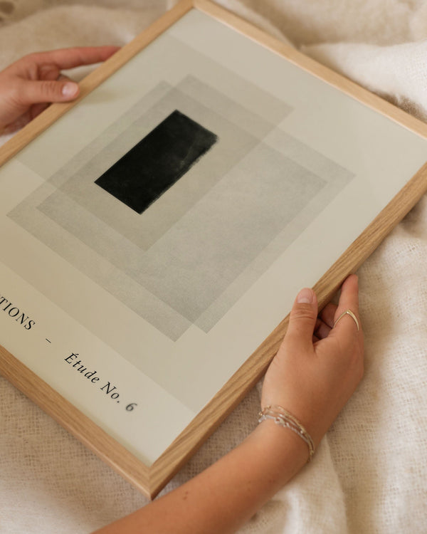 Our frames are made from high-quality materials and are available in solid oak, dark-stained oak, and black-painted pine. All frames come with genuine glass, while the largest sizes (70 × 100 cm and 100 × 140 cm) have 2 mm acrylic glass, which looks like glass but is lighter and more shatterproof (durable).