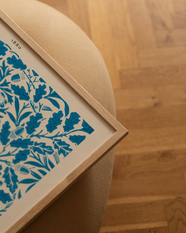 Our frames are made from high-quality materials and are available in solid oak, dark-stained oak, and black-painted pine. All frames come with genuine glass, while the largest sizes (70 × 100 cm and 100 × 140 cm) have 2 mm acrylic glass, which looks like glass but is lighter and more shatterproof (durable).