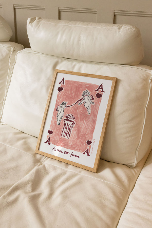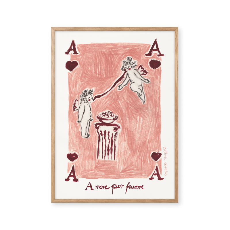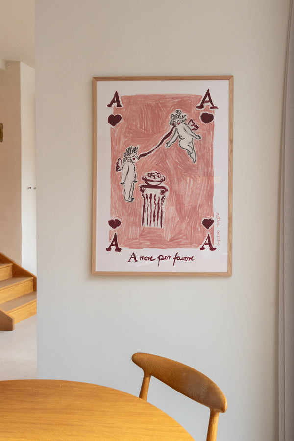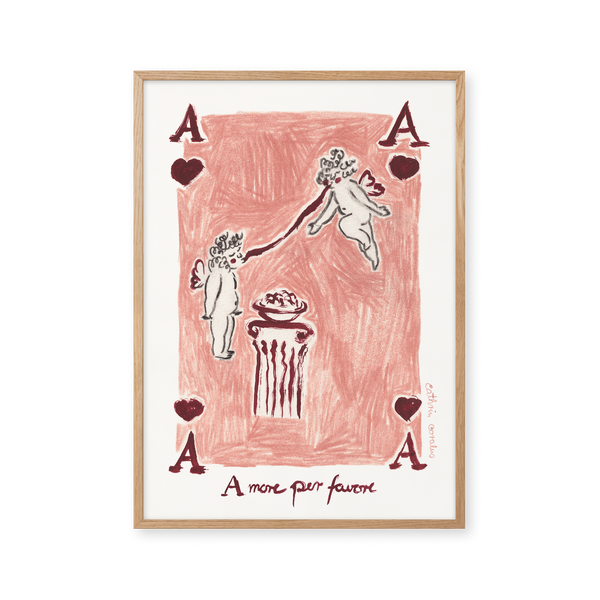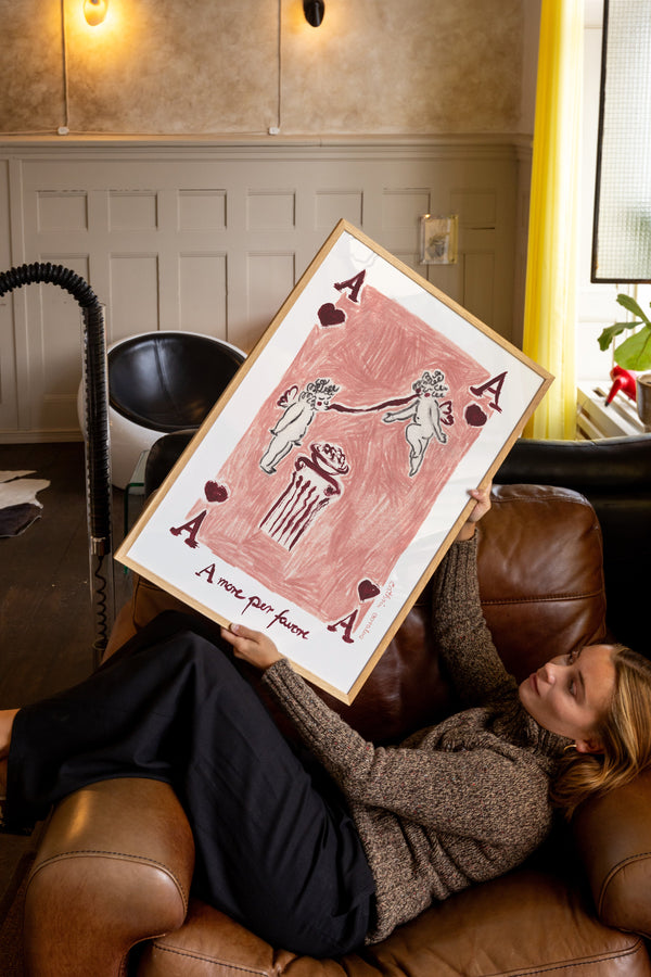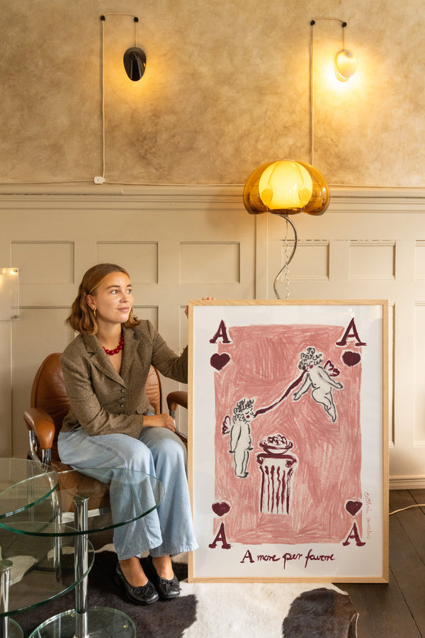 Cathrin Coralus kunstplakat "Amore per favore" er en del af en farverig kollektion skabt eksklusivt til Peléton. Motiverne hylder legende kompositioner, stærke farver og Cathrins finurlige billedunivers, hvor sentimentale temaer og en kunstnerisk lethed går hånd i hånd.