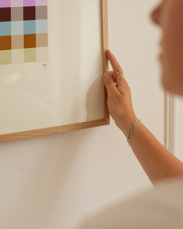Our frames are made from high-quality materials and are available in solid oak, dark-stained oak, and black-painted pine. All frames come with real glass, while the largest sizes (70 × 100 cm and 100 × 140 cm) have 2 mm acrylic glass, which looks like glass but is lighter and more shatterproof.