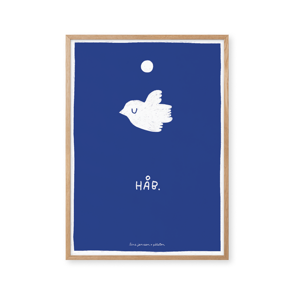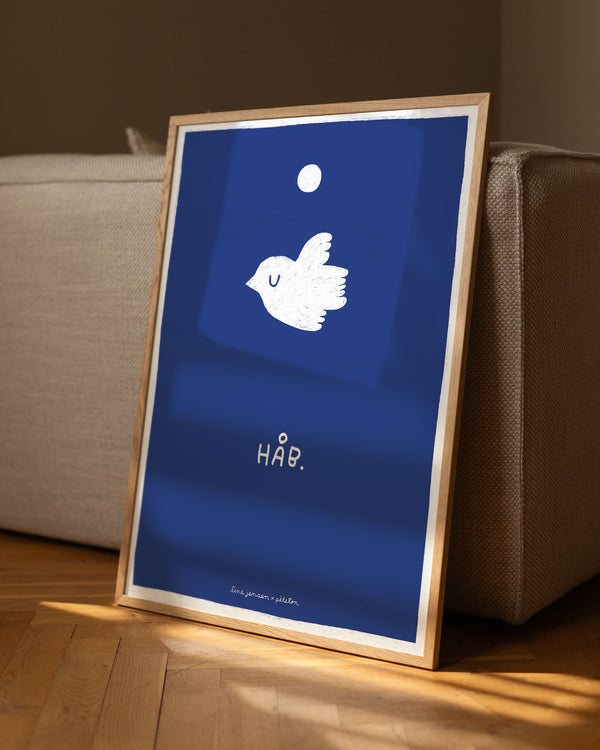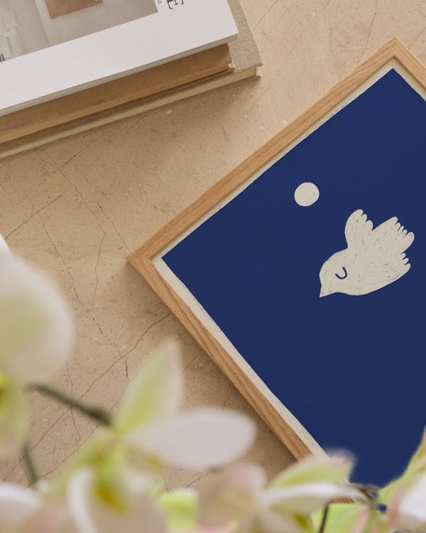 The art poster: “Dove - blue” by the artist Line Jensen is an illustrated poster curated by Peléton. It has been significant for Line Jensen, the poster is open to interpretation.