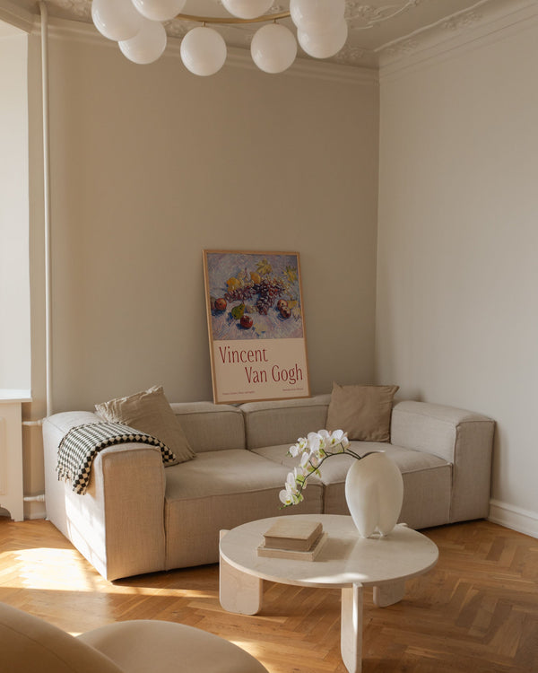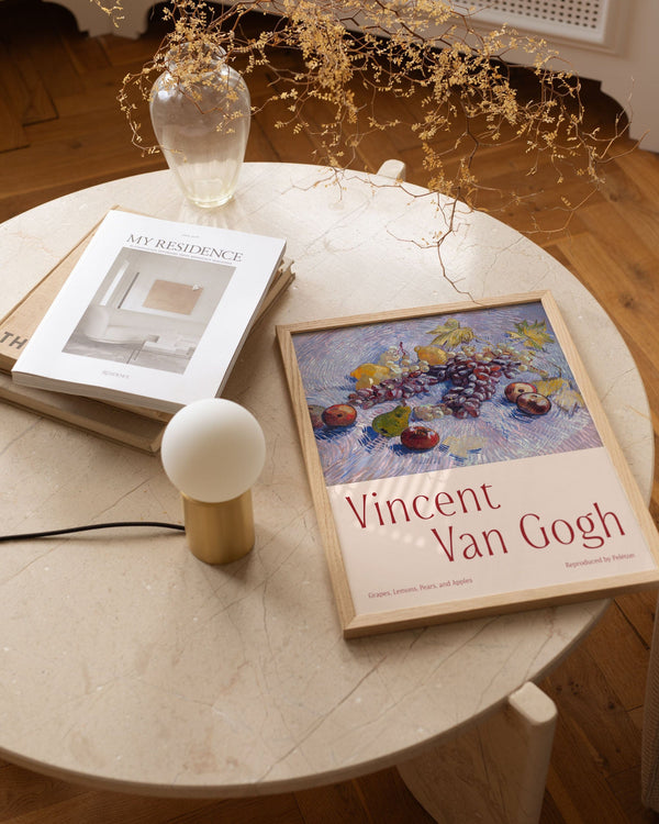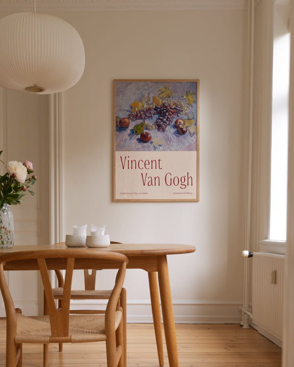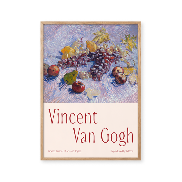 The art print: "Grapes, Lemons, Pears, and Apples" by the artist Vincent van Gogh is a painted poster recreated by Peléton. This poster series with Vincent van Gogh's art prints is characterized by his artworks with strong colors and dramatic, impulsive, and expressive brushwork. This poster is part of Peleton's vintage collection with museum layout. The art print is produced on quality paper with long durability, high opacity, and detailed color reproduction.
