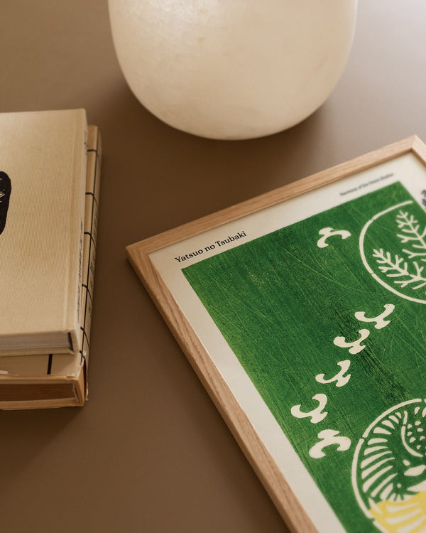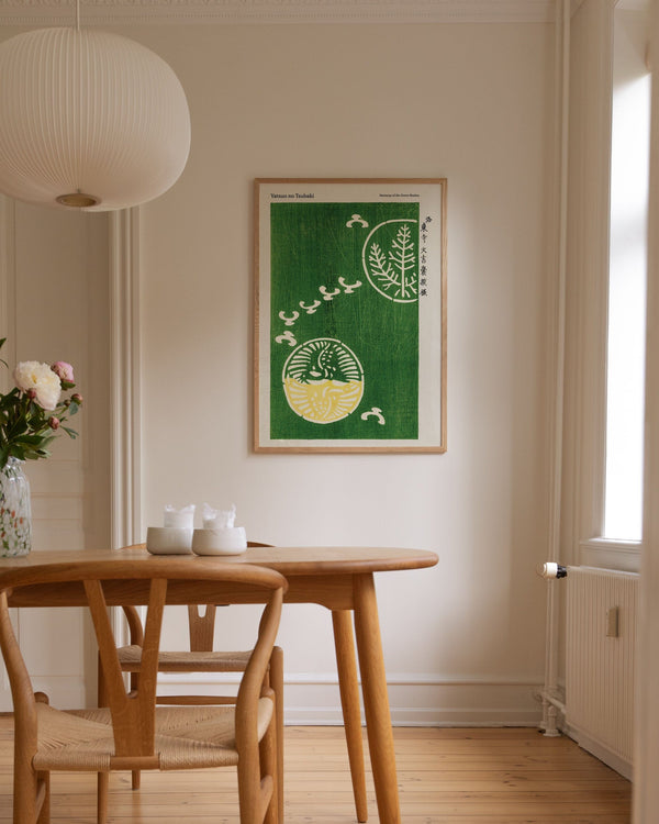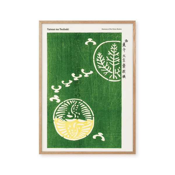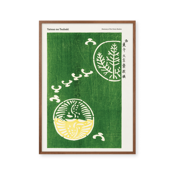 The art print: "Harmony of the Green Realms" by the artist Taguchi Tomoki is a poster, which Peléton has recreated from his woodcut collection "Yatsuo no tsubaki". This poster series with Taguchi Tomoki's art prints is characterized by his colorful woodcuts. This poster is part of Peleton's vintage collection with museum layout. The art print is produced on quality paper with long durability, high opacity, and detailed color reproduction.