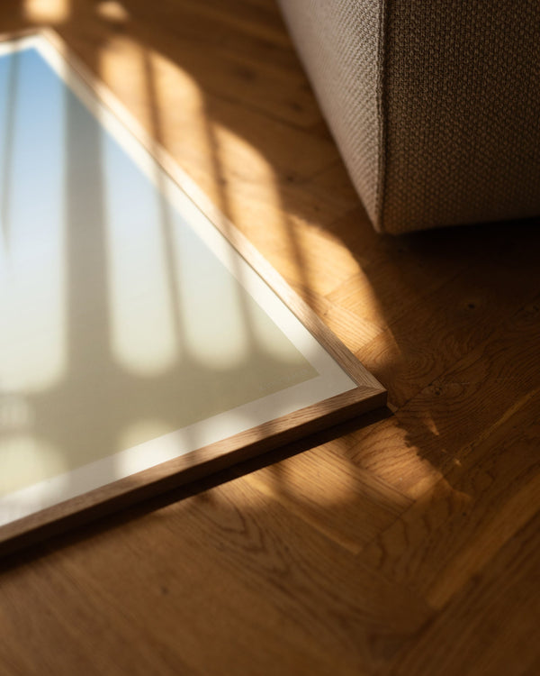 Our frames are made from high-quality materials and are available in solid oak, dark-stained oak, and black-painted pine. All frames come with real glass, while the largest sizes (70 × 100 cm and 100 × 140 cm) have 2 mm acrylic glass, which looks like glass but is lighter and more shatterproof.