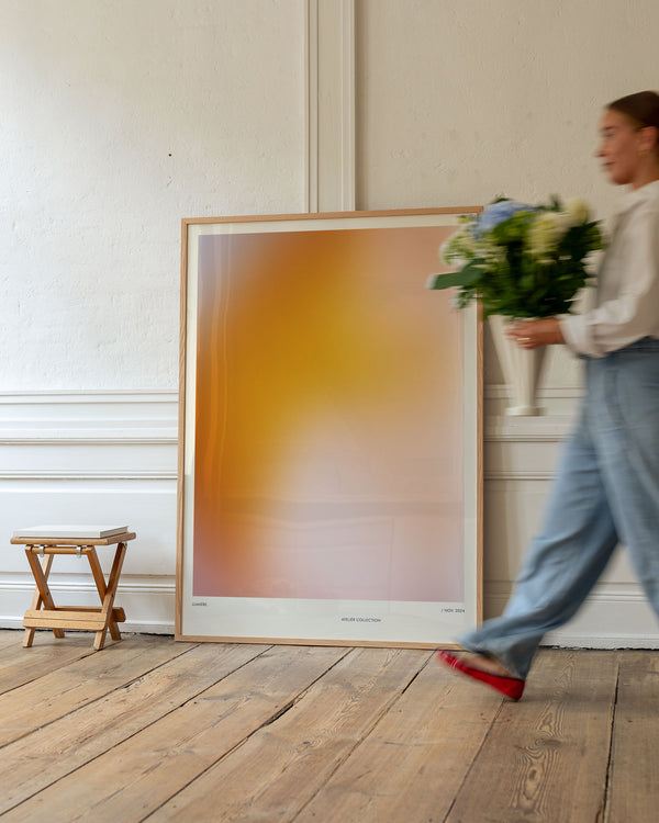 The Frame dimensions indicate the size of the art prints they fit. The outer dimensions of the Frame itself will be slightly larger, depending on the chosen profile and size. The Frames in sizes A4 to 50x70 cm have a width and depth of 1.5 cm and come with real glass. In sizes over 70x100 cm, the Frames measure 2 cm in both width and depth and come with plexiglass that mimics real glass.