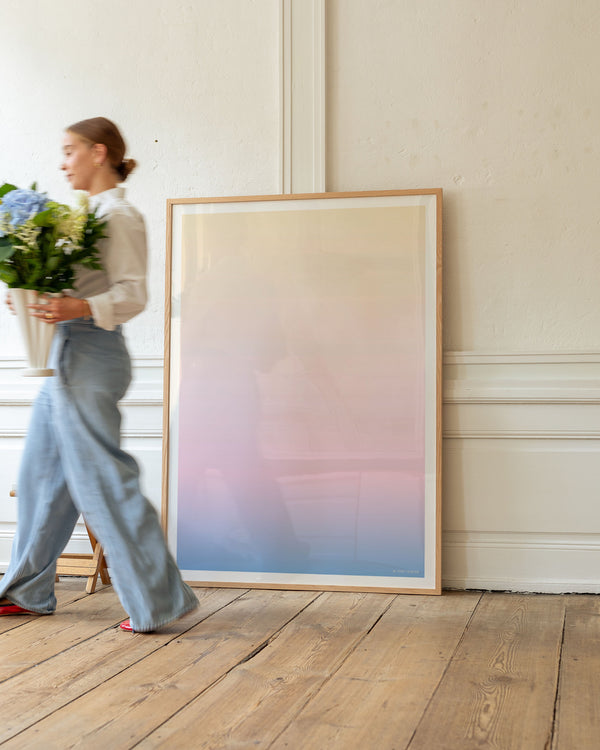 The art print: “Mist” by the artists Mie & Him is a graphically illustrated poster exclusively made for Peléton. It has been important to them that the poster is open to interpretation. This work is part of a collection of exclusive art prints that express minimalism and simplicity.