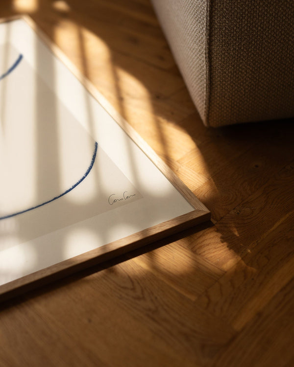 Our frames are made from high-quality materials and are available in solid oak, dark-stained oak, and black-painted pine. All frames come with real glass, while the largest sizes (70 × 100 cm and 100 × 140 cm) have 2 mm acrylic glass, which looks like glass but is lighter and more shatterproof.