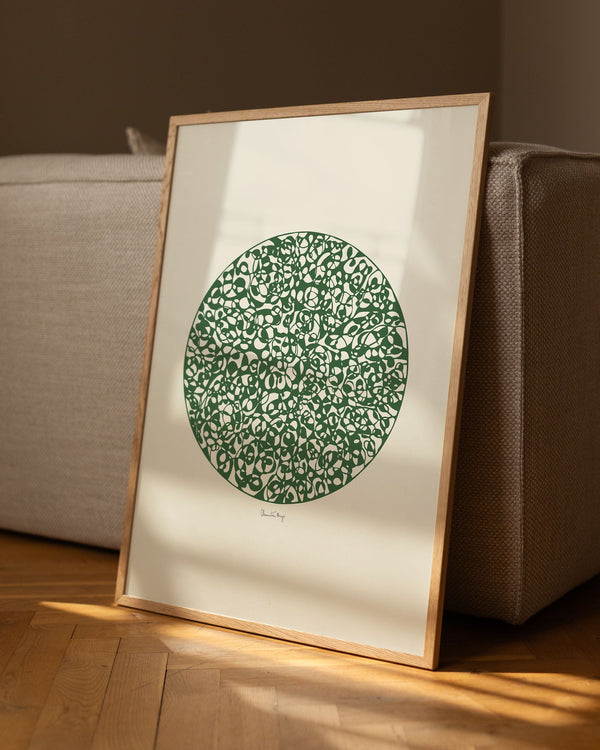 The art poster: “Papercut 10 - Moss Green” by the artist Little Detroit is an illustrated poster made exclusively for Peléton. It has been significant for Little Detroit that the poster is open to interpretation.