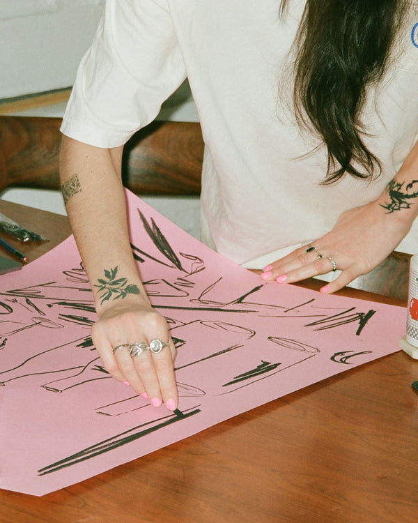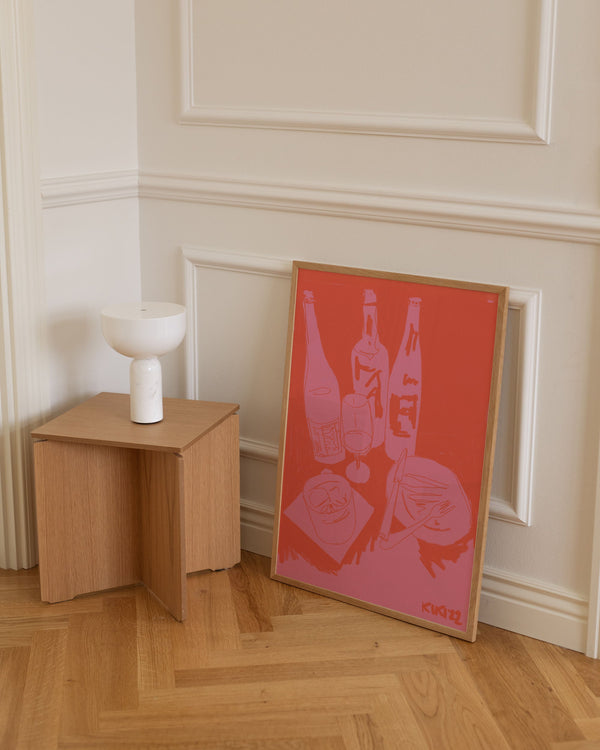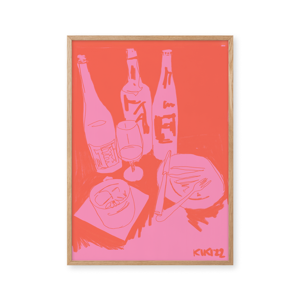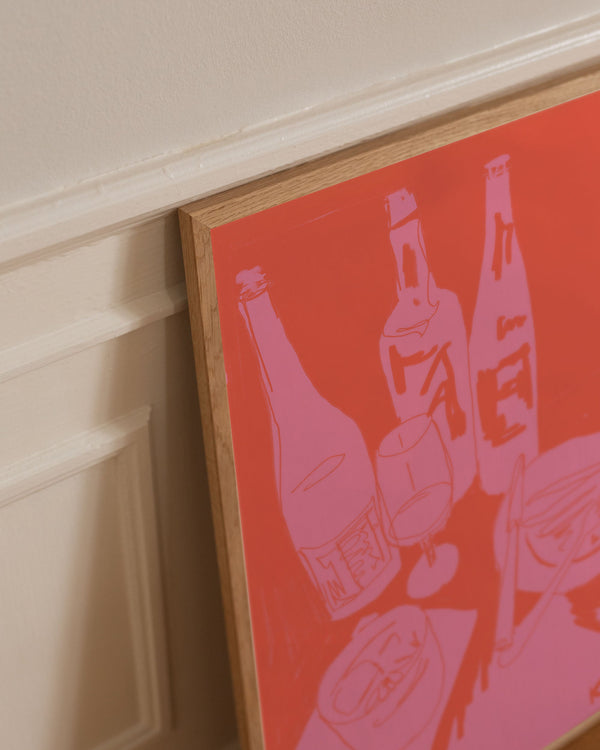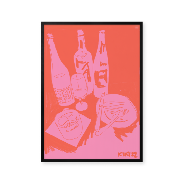 The art poster: "Paris" by the artist Kiki Makes is an illustrated poster curated for Peléton. The poster is inspired by a meal that Kiki and her sister shared at their favorite place in Paris, Aux Deux Amis. The waiters served them their favorite amaro, a glass of sherry, and a plate of anchovies served in olive oil. This work was created digitally using minimalist colors and lines.
