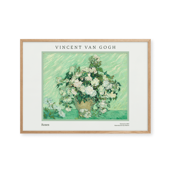 The art print: "Roses" by the artist Vincent van Gogh is a painted poster recreated by Peléton. This poster series with Vincent van Gogh's art prints is characterized by his artworks with strong colors and dramatic, impulsive, and expressive brushwork. This poster is part of Peleton's vintage collection with museum layout. The art print is produced on quality paper with long durability, high opacity, and detailed color reproduction.