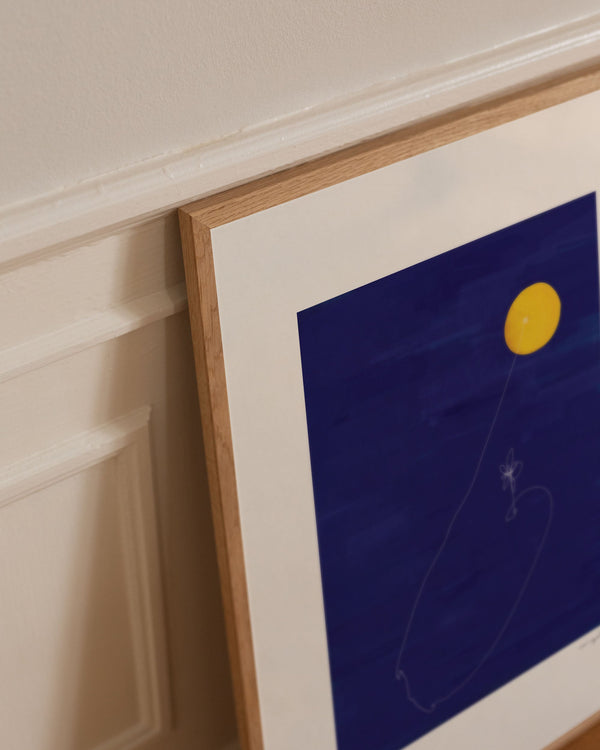 The art print: “Take Me To The Moon” by artists Mie & Him is a graphically illustrated poster exclusively made for Peléton. It has been important to them that the poster is open to interpretation. This work is part of a collection of exclusive art prints that express minimalism and simplicity.