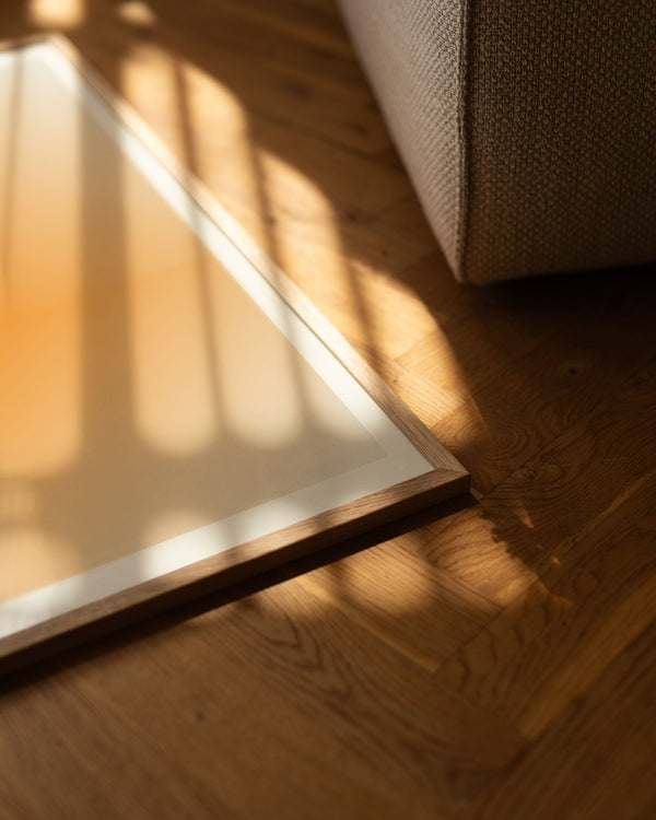 Our frames are made from high-quality materials and are available in solid oak, dark-stained oak, and black-painted pine. All frames come with real glass, while the largest sizes (70 × 100 cm and 100 × 140 cm) have 2 mm acrylic glass, which looks like glass but is lighter and more shatterproof.
