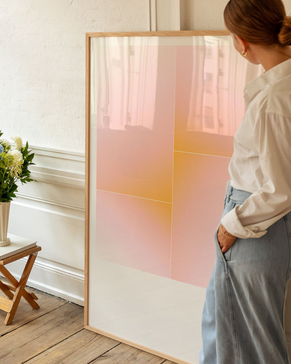 The art print: “Transendence” by artists Mie & Him is a graphically illustrated poster exclusively made for Peléton. It has been important to them that the poster is open to interpretation. This work is part of a collection of exclusive art prints that express minimalism and simplicity.